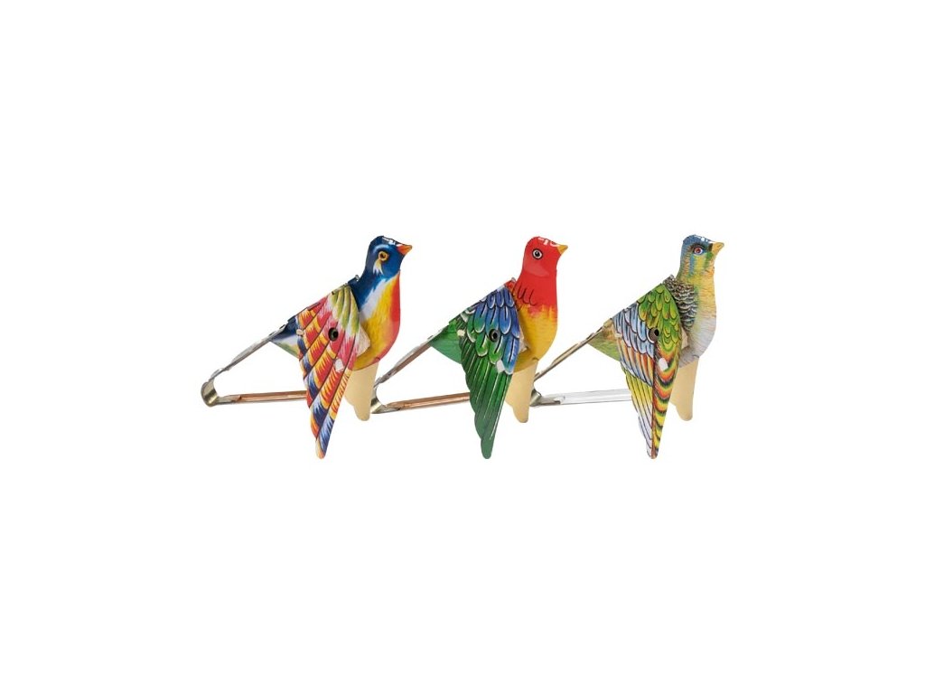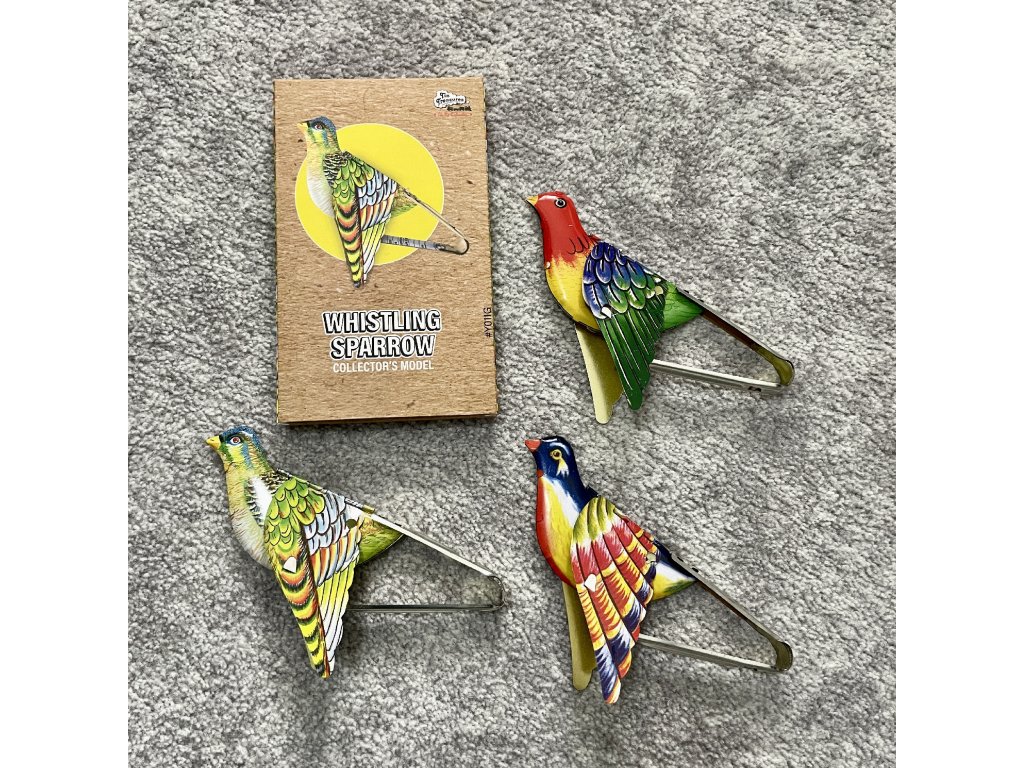 Kovový vtáčik, ktorý mechanicky máva krídlami po stlačení kovovej časti a vie nádherne štebotať...